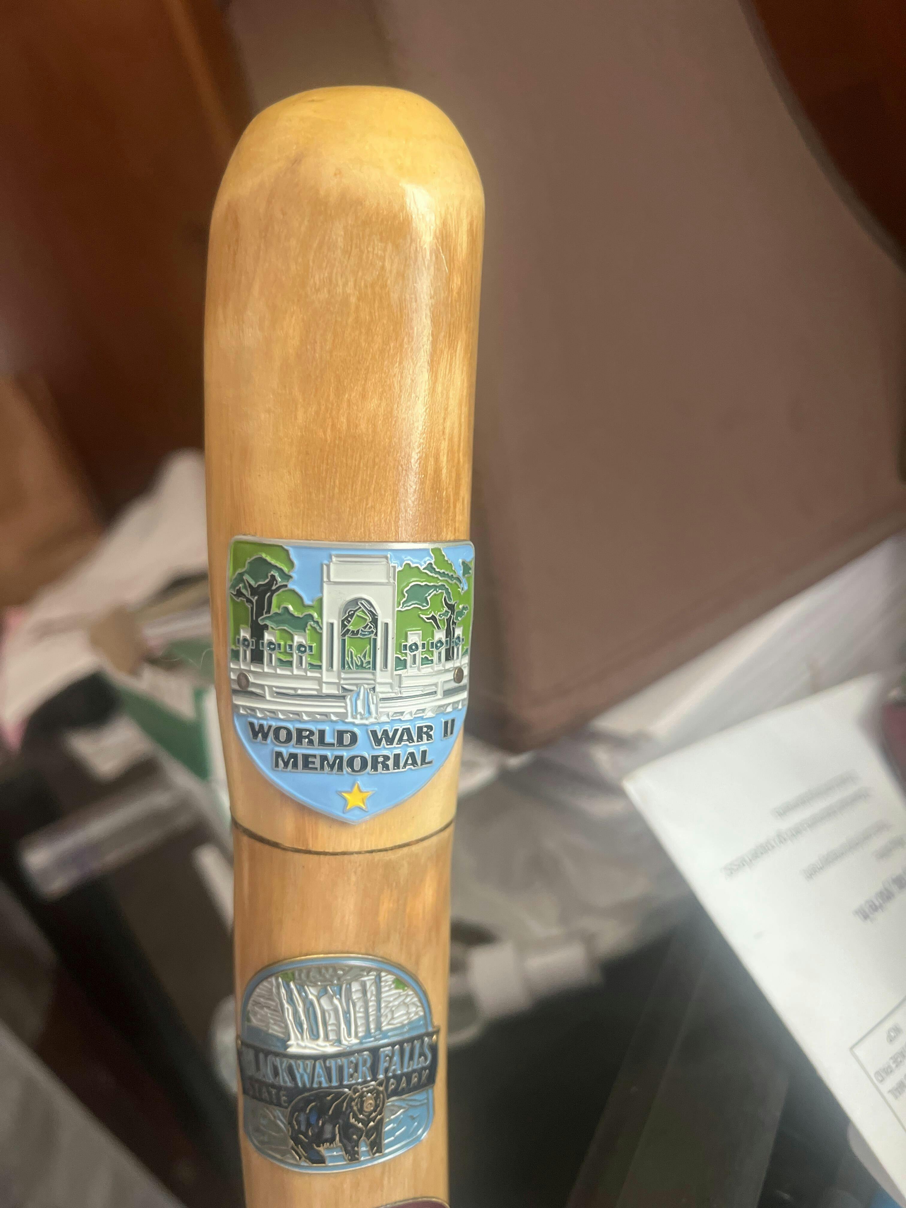 Also visible is one of the two triumphal arches of the monument. These arches, on the north and south sides, bear the words Atlantic and Pacific, representing the two theatres of the war. The gold star at the very bottom of the hiking stick is an homage to the 4,048 gold stars on the memorial, each reflecting the loss of 100 American service members.